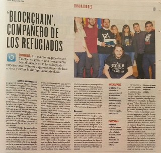 Hoy, uno de nuestros proyectos, Hack The Borders, ha sido noticia en el Suplemento de Innovación de El Mundo (en papel, aún no hay versión online). Este proyecto, que fue publicado en la web de hackforgood junto con otros cientos, permite a las ONG llevar un seguimiento real del tránsito de los refugiados en su camino hacia la seguridad que ofrecen sus destinos. Usar la block chain permite que los datos sean públicos, que puedan ser auditados por cualquiera de forma gratuita y que no puedan, jamás, ser manipulados. Para ayudar a salvaguardar los datos de los refugiados, su identificación se almacenará en forma de token en la cadena de bloques.