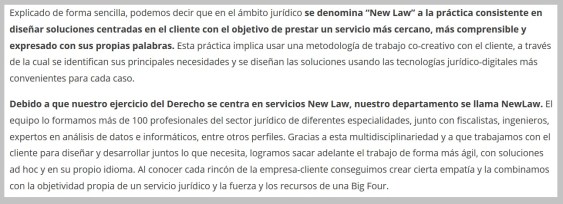 Un ejemplo de ALSP lo tenemos en el departamento New Law PwC, del que formo parte (ver noticia Pablo Fernández Burgueño se incorpora a PwC Tax & Legal en calidad de ‘of counsel’, publicada por IEB)